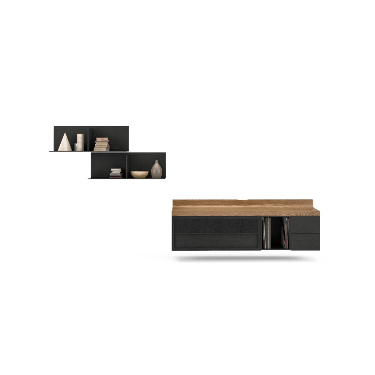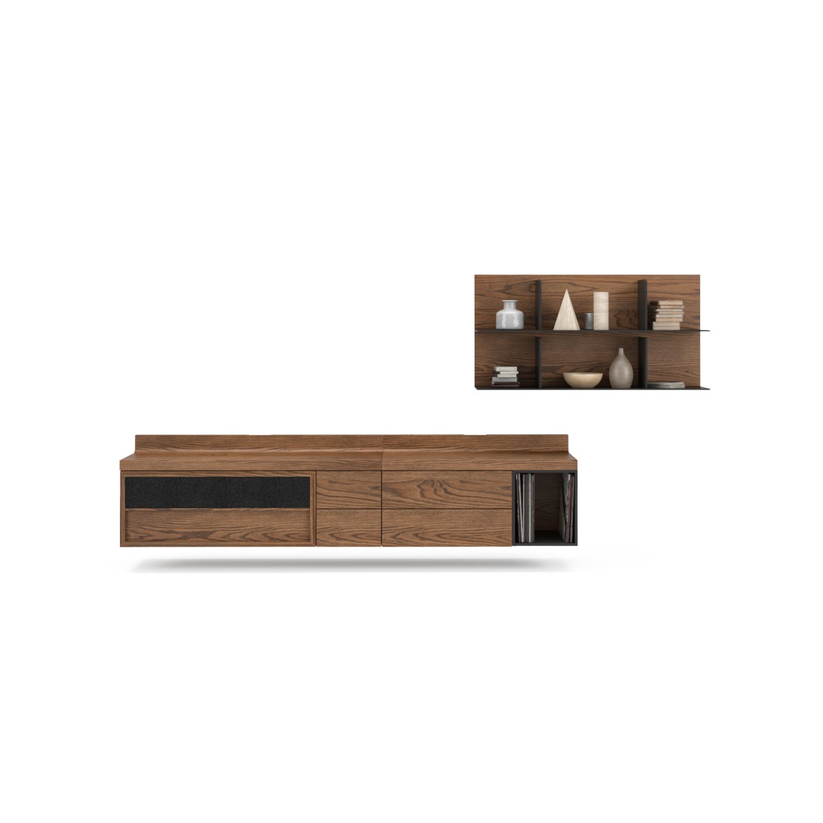 Configuration polyvalente combinant un bureau mural minimaliste et un meuble TV flottant. Le design en bois naturel offre une touche chaleureuse tandis que les étagères modulables apportent une solution de rangement flexible. Cette configuration optimise l'espace avec élégance, parfaite pour les intérieurs modernes cherchant à allier travail et détente dans une seule pièce.